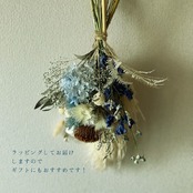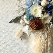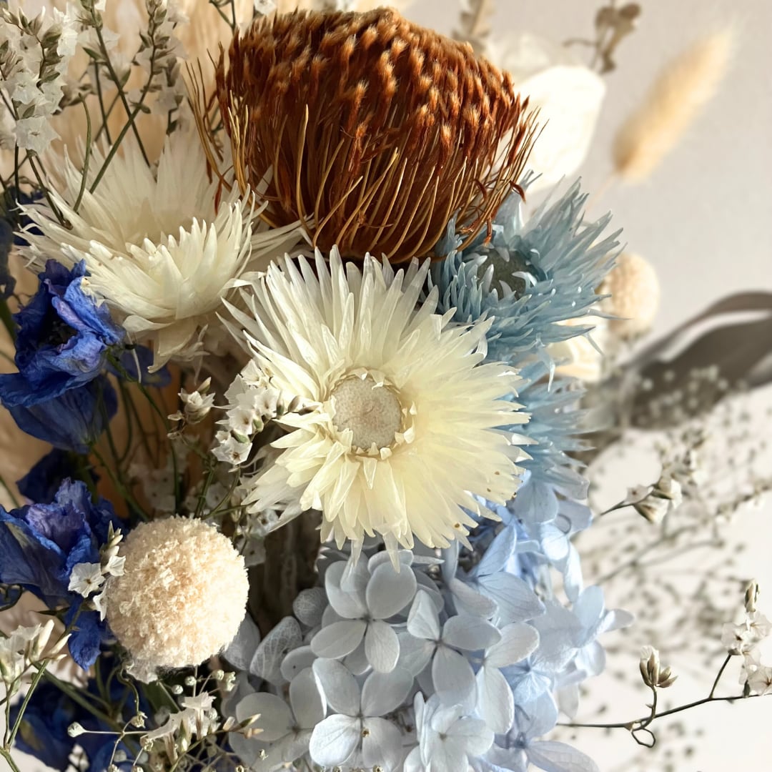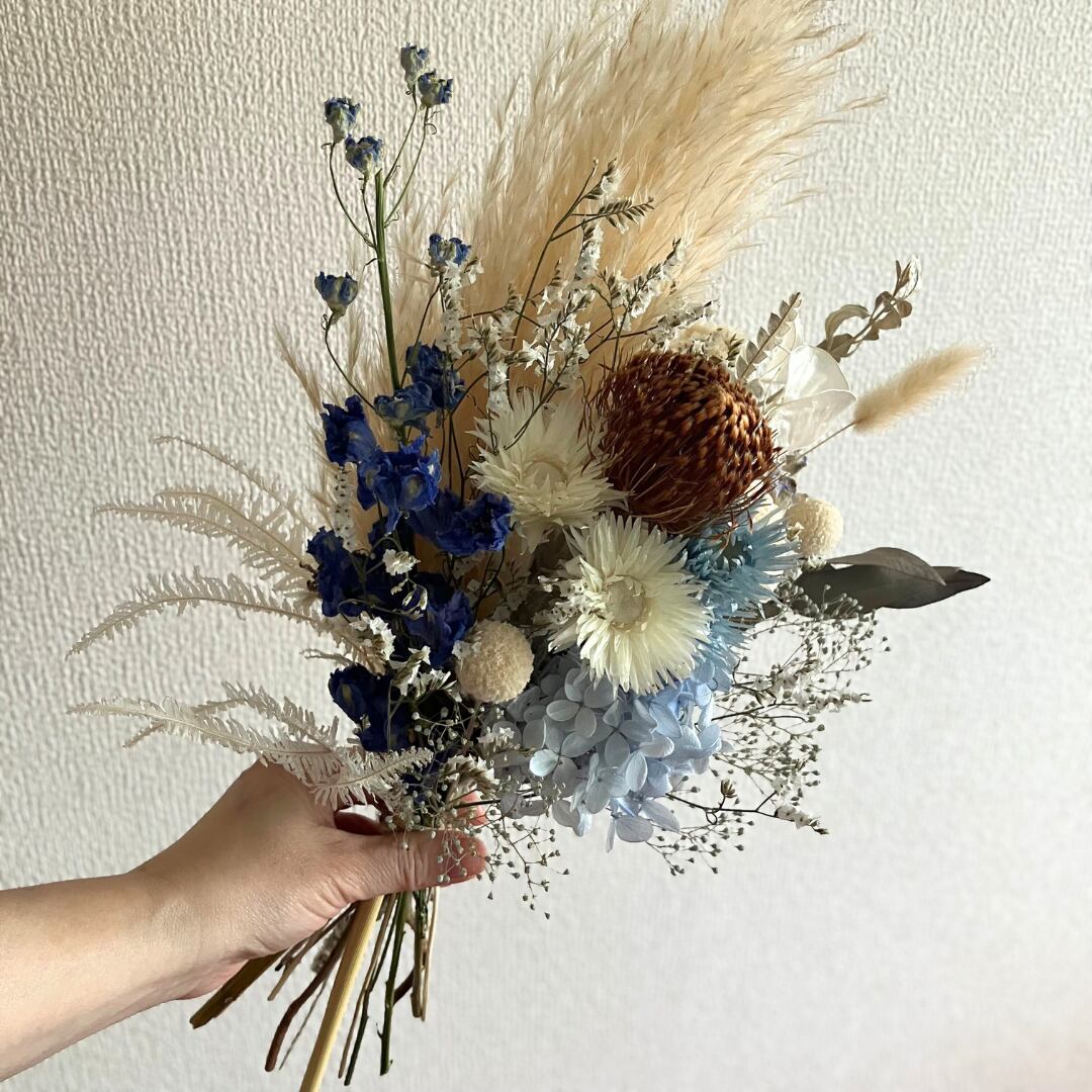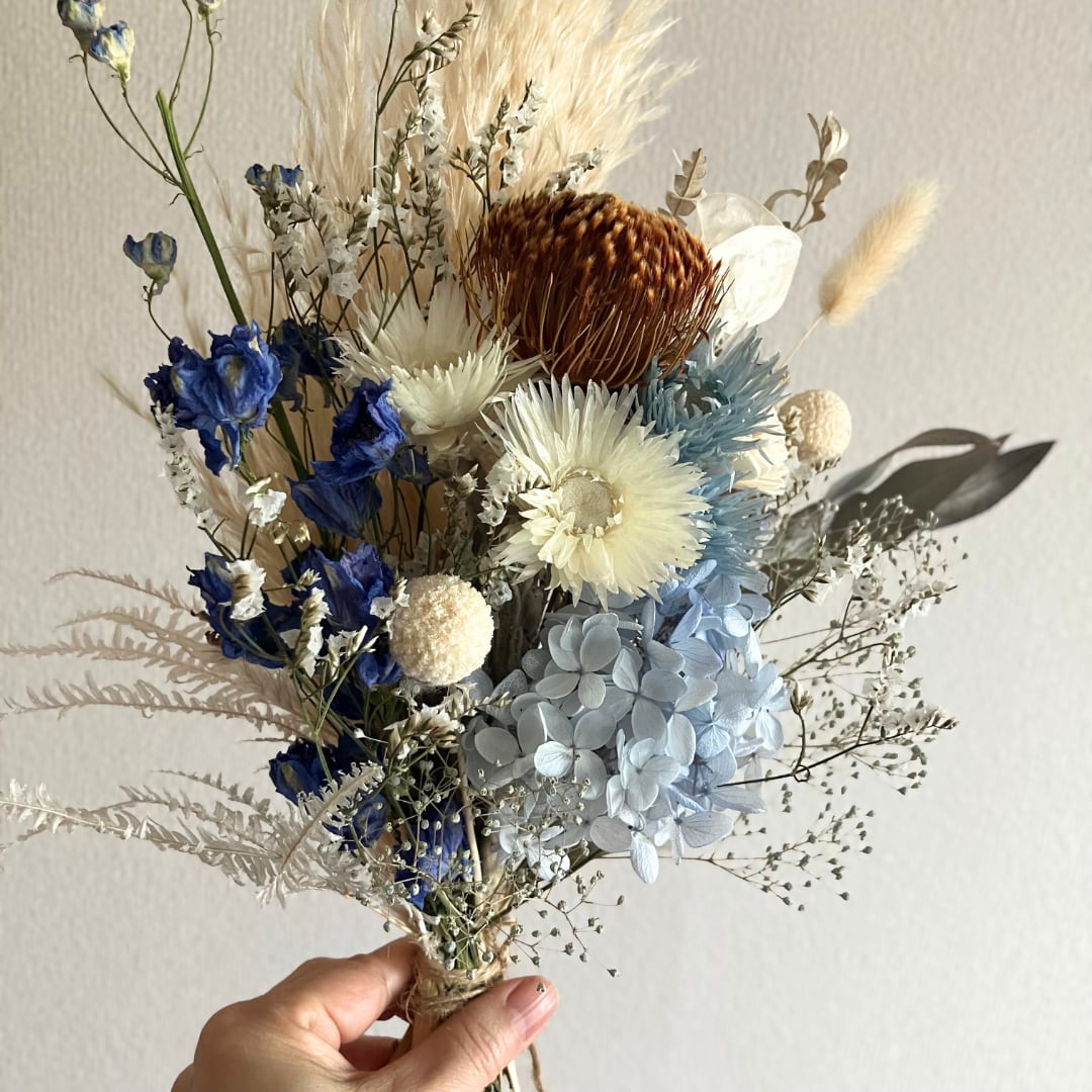 青と白のドライフラワーブーケです。