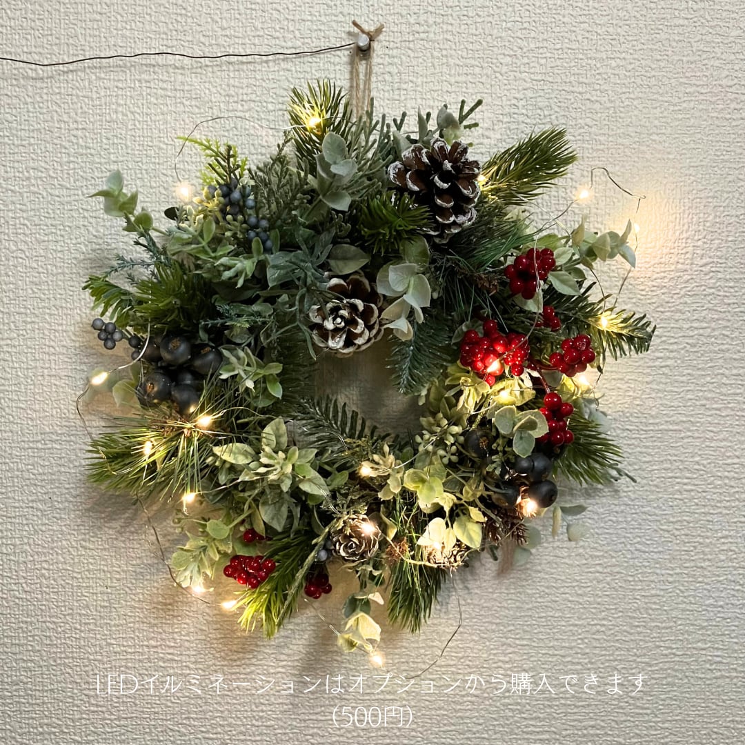 クリスマスシーズンはもちろん、ナチュラルなインテリアとして通年お楽しみいただけるリースです。