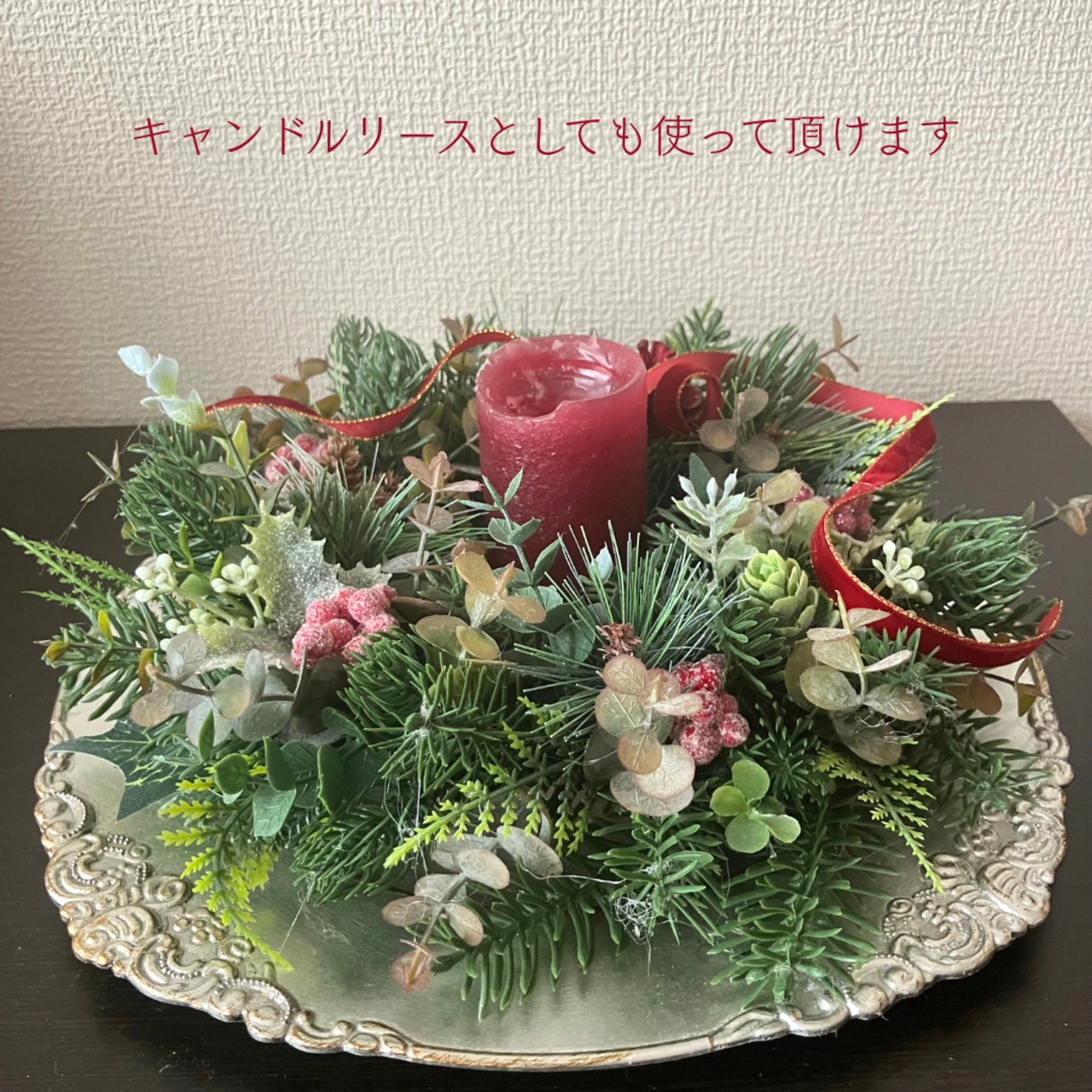 美しいアーティフィシャルフラワーを使用したこちらのリースは、モミの木やナチュラルなグリーン、レッドのアクセントがクリスマスの雰囲気を一層際立てます。