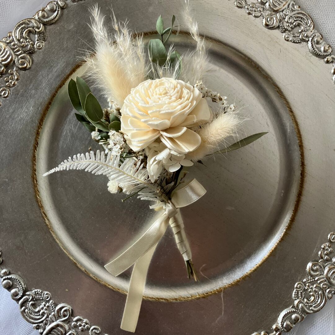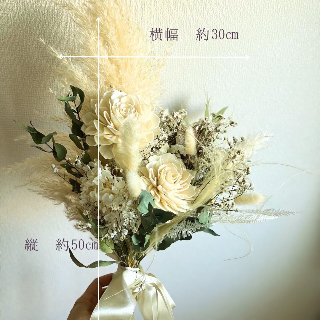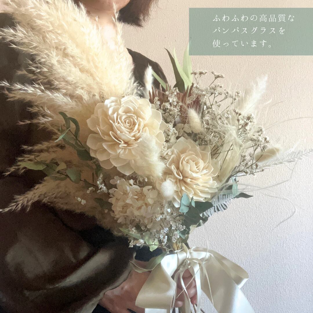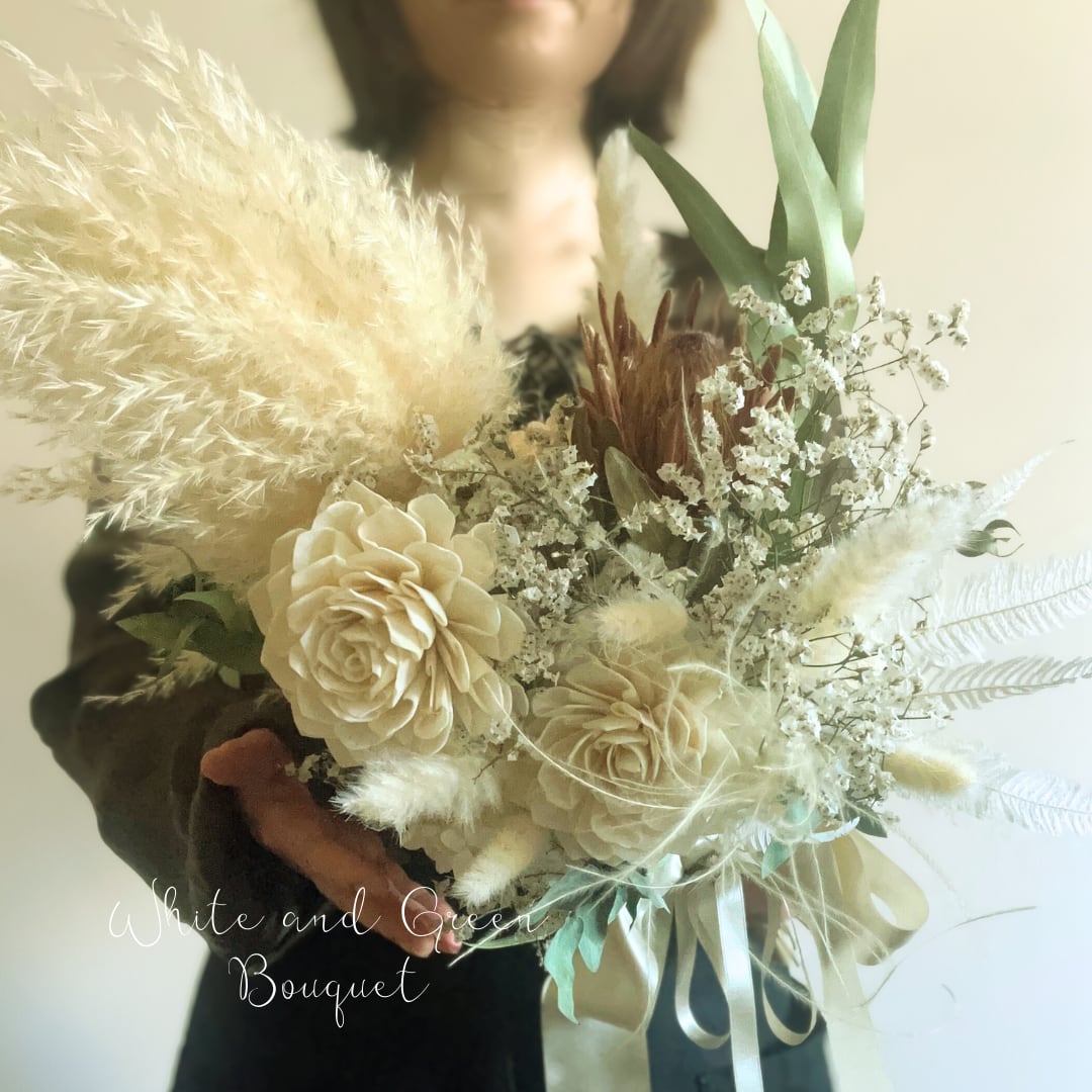 ウエディングブーケ ブートニア付き ドライフラワー 白グリーン エレガント ダリア パンパスグラス スターチス プロテア 華やか ナチュラル