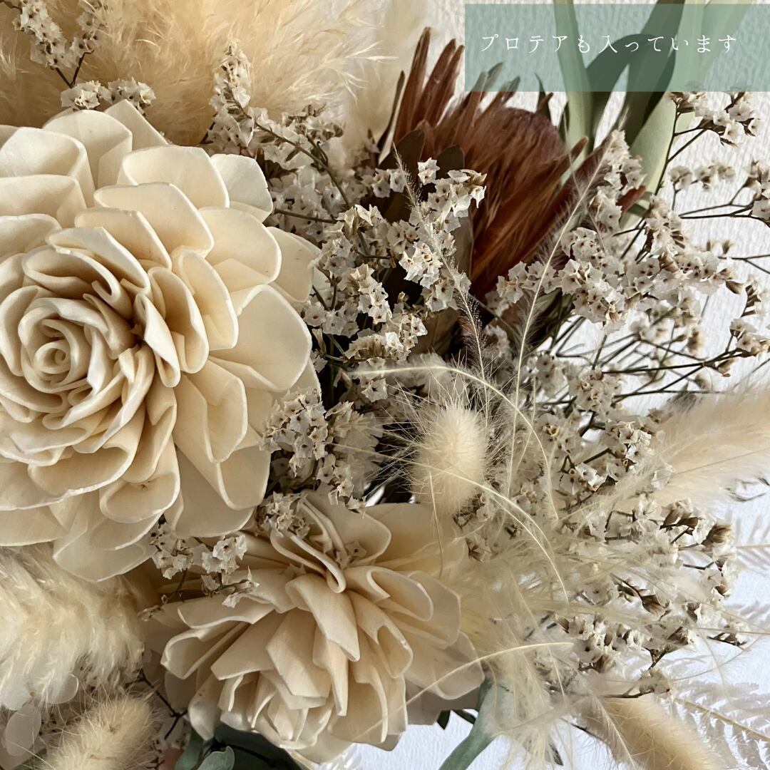 ふわふわの高品質なパンパスグラス、存在感のあるプロテア、華やかなソラフラワーのダリア、ナチュラルな雰囲気が人気のスターチス、形や色が美しいユーカリなど、選りすぐりの花材を合わせてお作りしております。