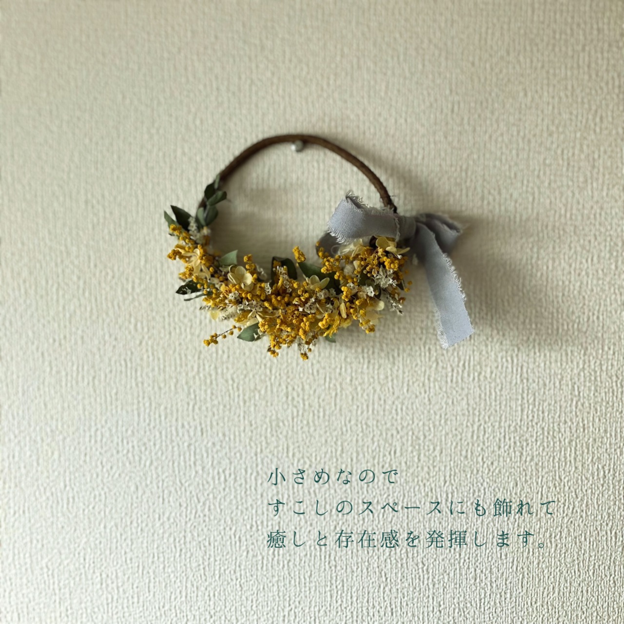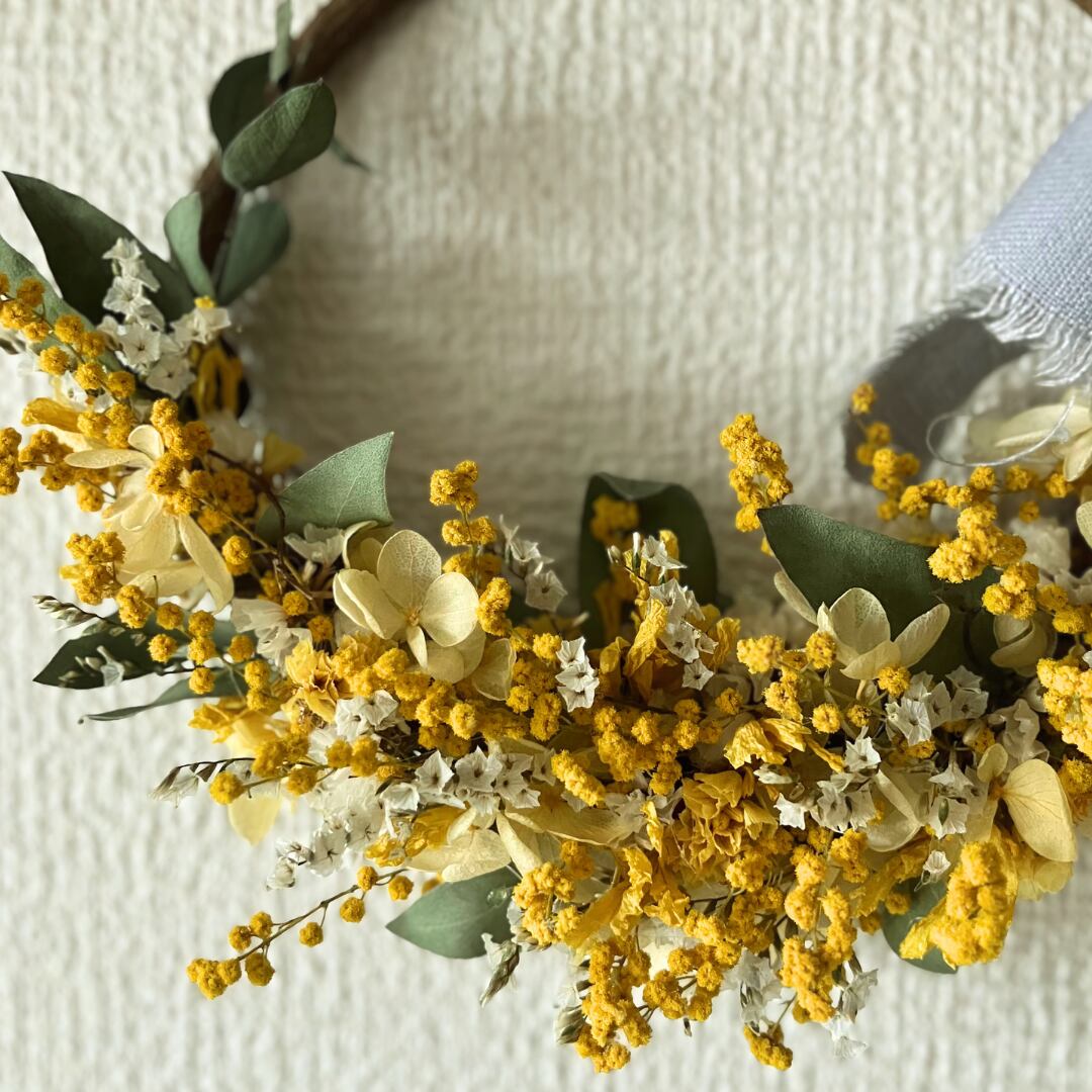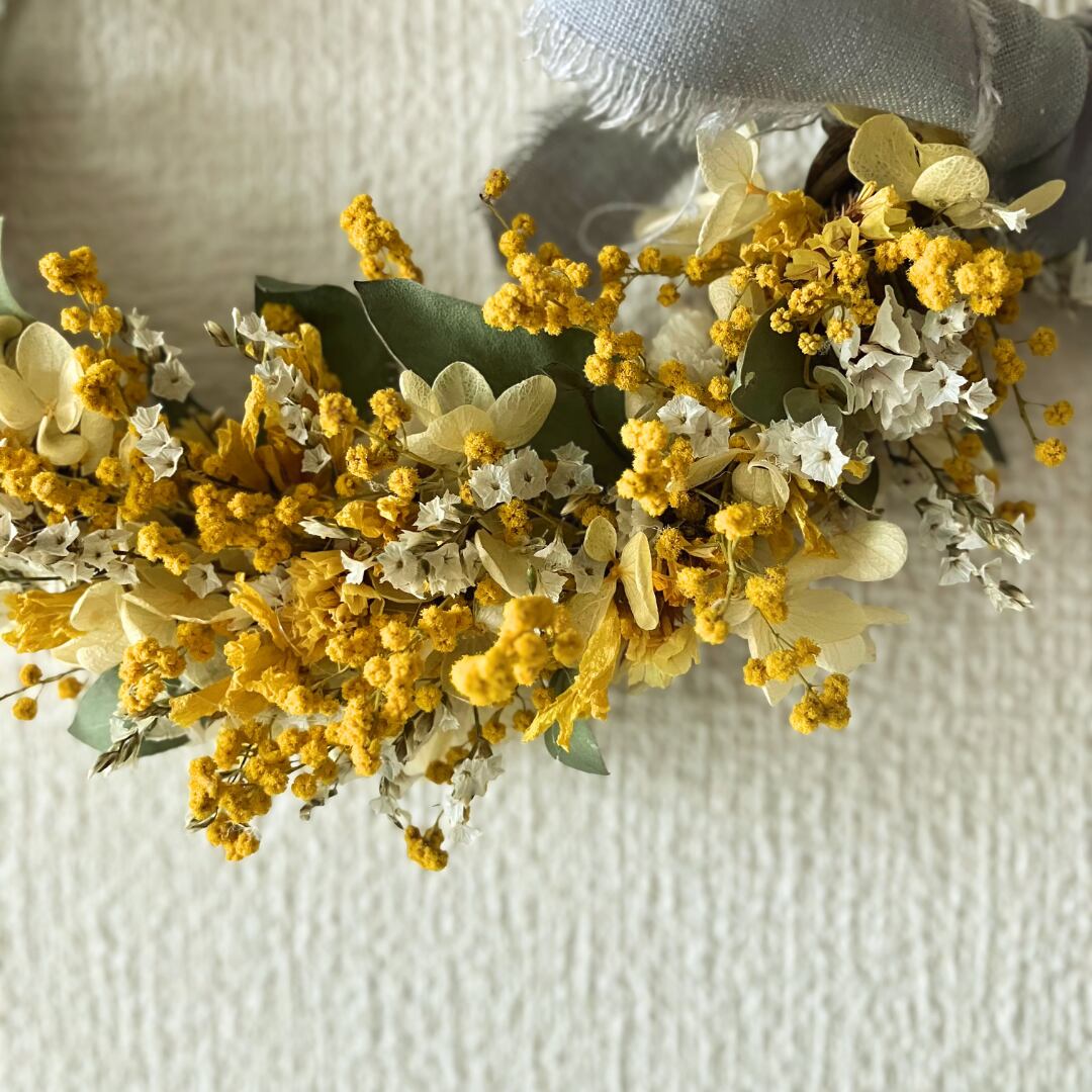 ミモザのドライフラワーと黄色のあじさい、スターチスなどを使用したナチュラルな可愛らしさが魅力のハーフリース。