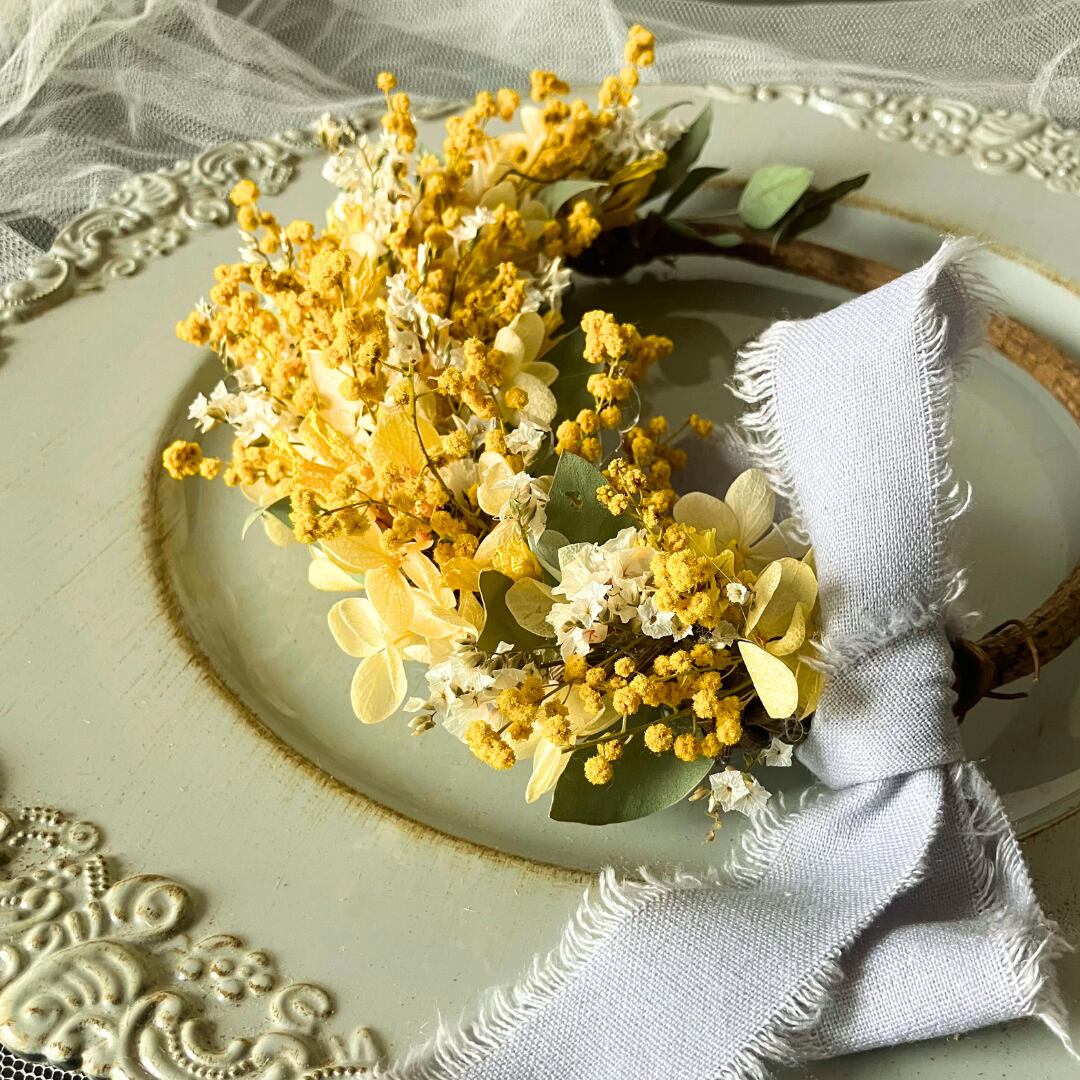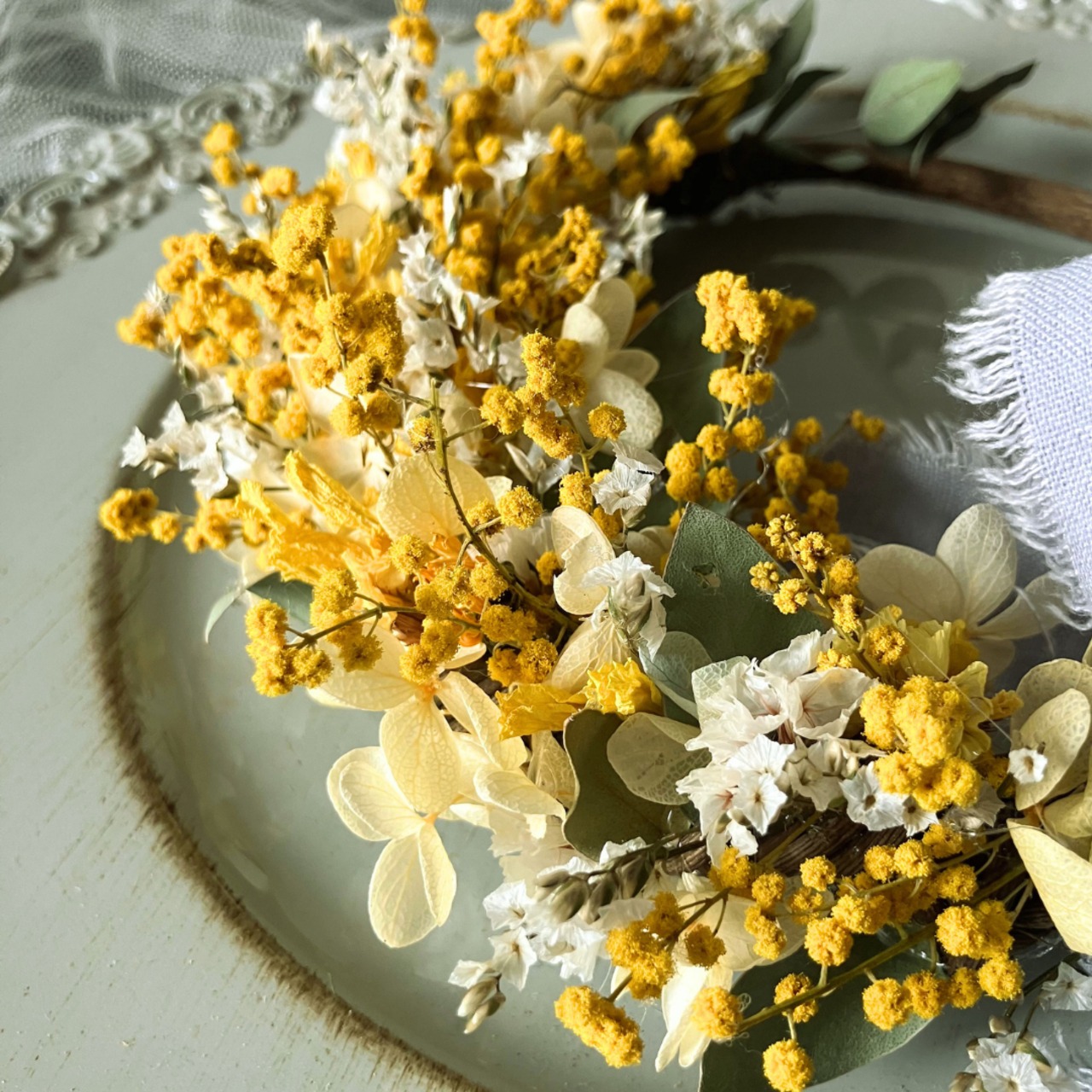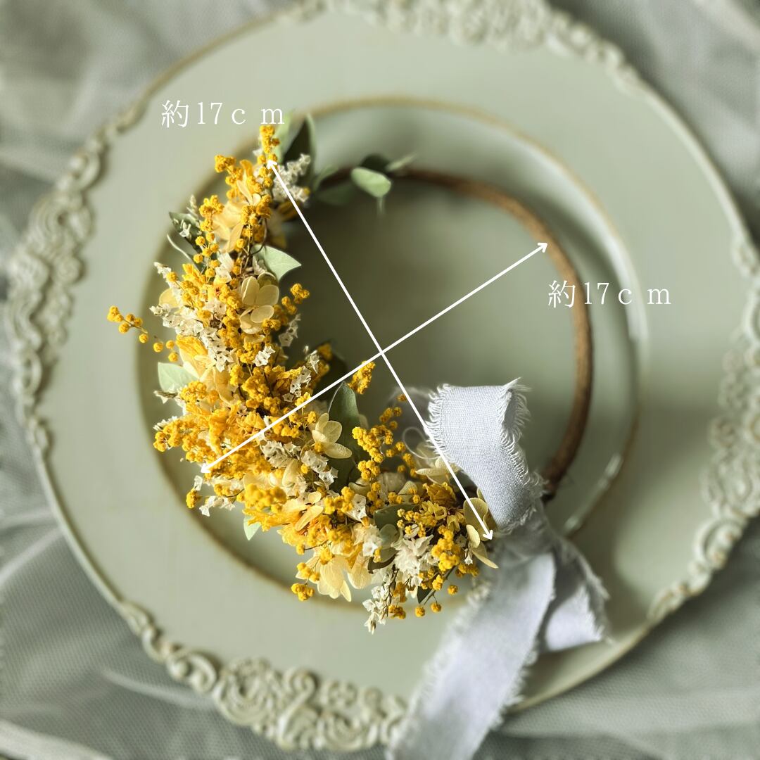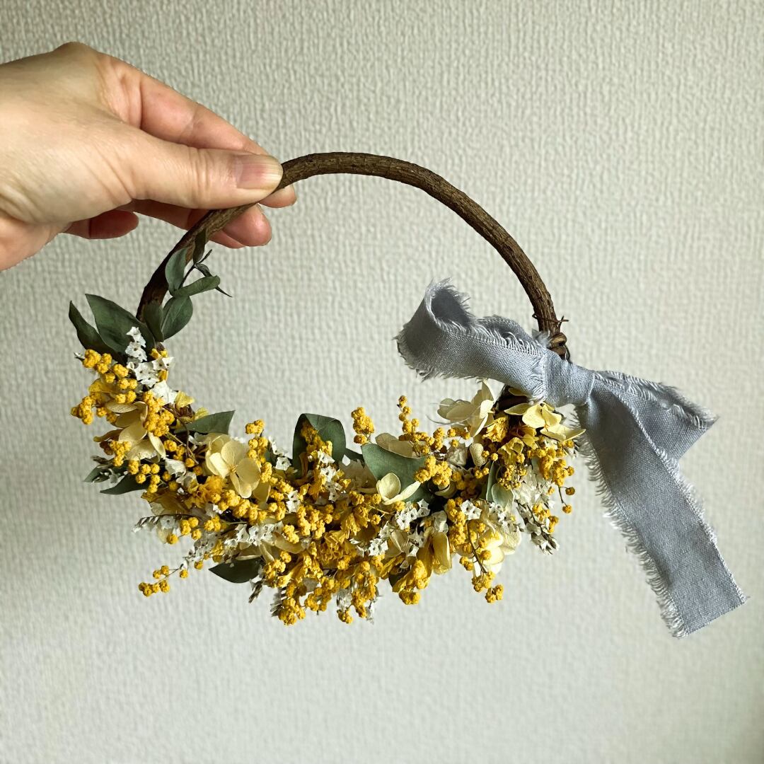 ミモザのドライフラワーと黄色のあじさい、スターチスなどを使用したナチュラルな可愛らしさが魅力のハーフリース。