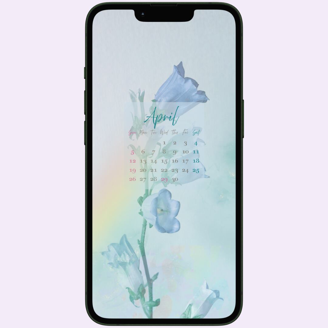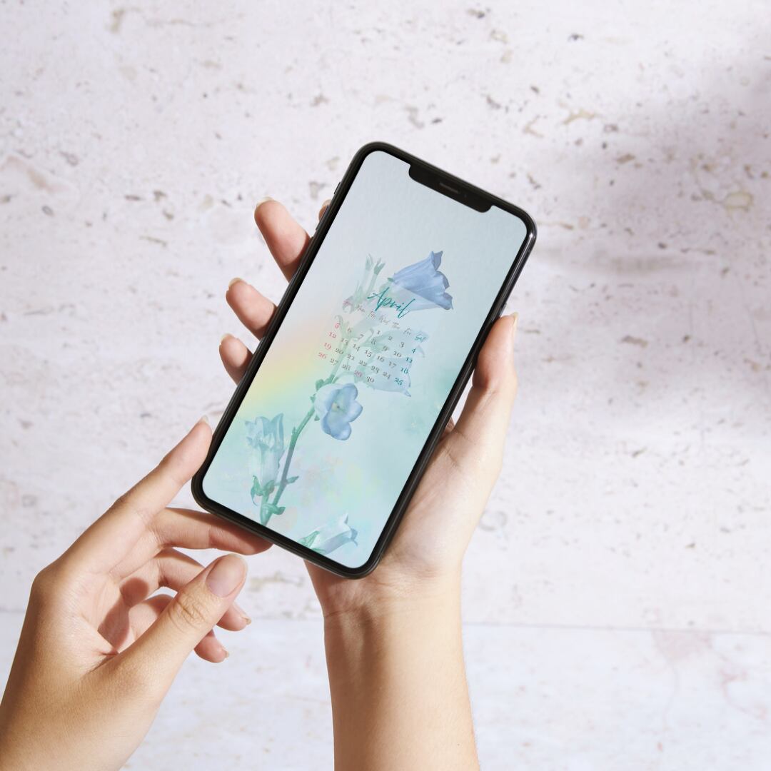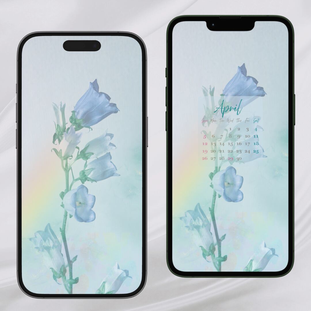 スマホ壁紙 待受け 2026年カレンダー 4月 カンパニュラ フラワー パステルカラー ボタニカル