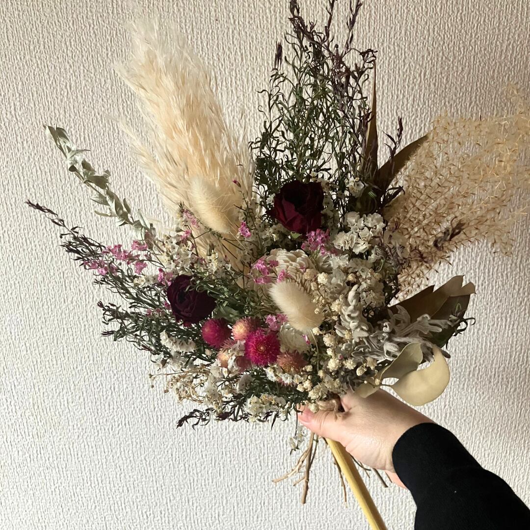 パンパスグラスと、鮮やかな赤バラ、愛らしいピンク千日紅が織りなす華やかなドライフラワーブーケです。ススキの柔らかな風合いが加わり、ふんわりとした印象を与えます。